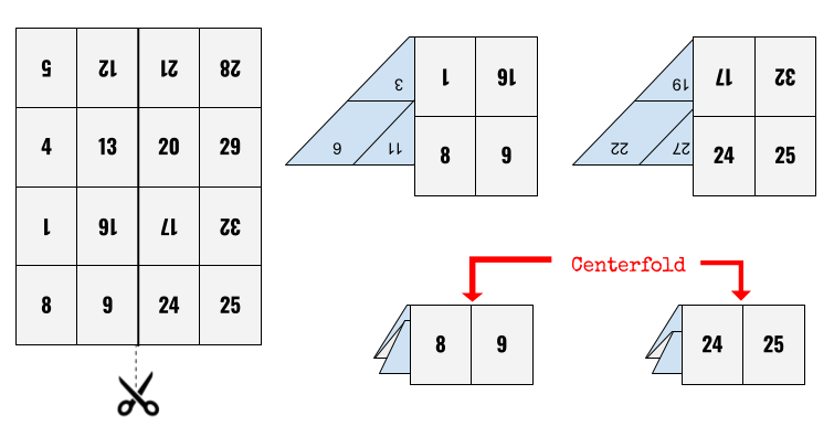 Folding these two layouts is slightly more complex than the simple single-fold folio. Both of these have been designed so that the first fold is parallel to the short edge of the paper - eg, if you hold the page in portrait orientation, you will be folding the top edge to the bottom. One side of the page will have consecutive numbers across this fold (ie, 3 and 30 on the top row, 2 and 31). Fold inward across this line (so that 3 has been folded to lay against 2, and 30 against 31). The next fold is along the other paper axis (parallel to the original long edge). For quarto, you want to find the side with the numbers closest together, and fold inwards to match them (this will be consecutive on the innermost sheet). For octavo, look at the bottom-most row and find the consecutive pair, then fold inward. Octavo has one last fold, for which you want to find the pair remaning that are closest, and fold them together.