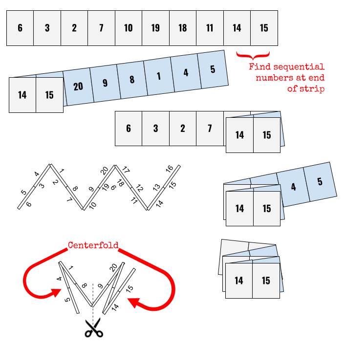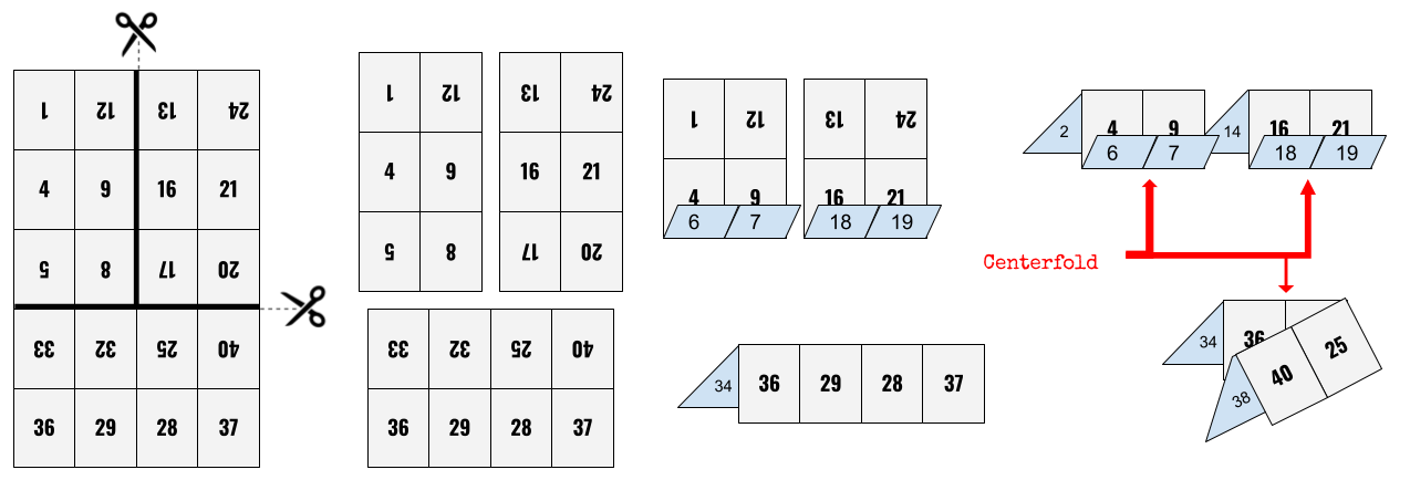 Cut out the rows. Fold up the folios like a zig-zag (two per face). Then fold the center of the text (smoosh the two matching page numbers together).